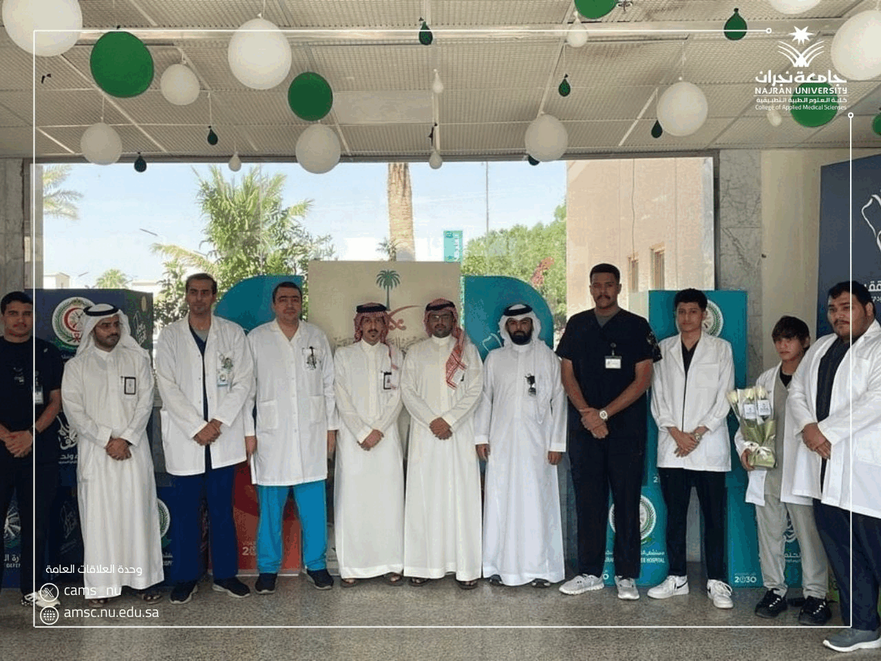 As part of the activities of the Watan Volunteer Carnival of Najran University, the College of Applied Medical Sciences, represented by the Community Service Unit, visited patients at the Armed Forces Hospital in Najran. During the visit, a number of souvenirs were presented, wishing them a speedy recovery. We would like to extend our sincere thanks to His Excellency Brigadier General Dr. Hamdan bin Hamid Al-Shehri, Director of the Armed .Forces Hospital in Najran, for providing the opportunity to visit patients