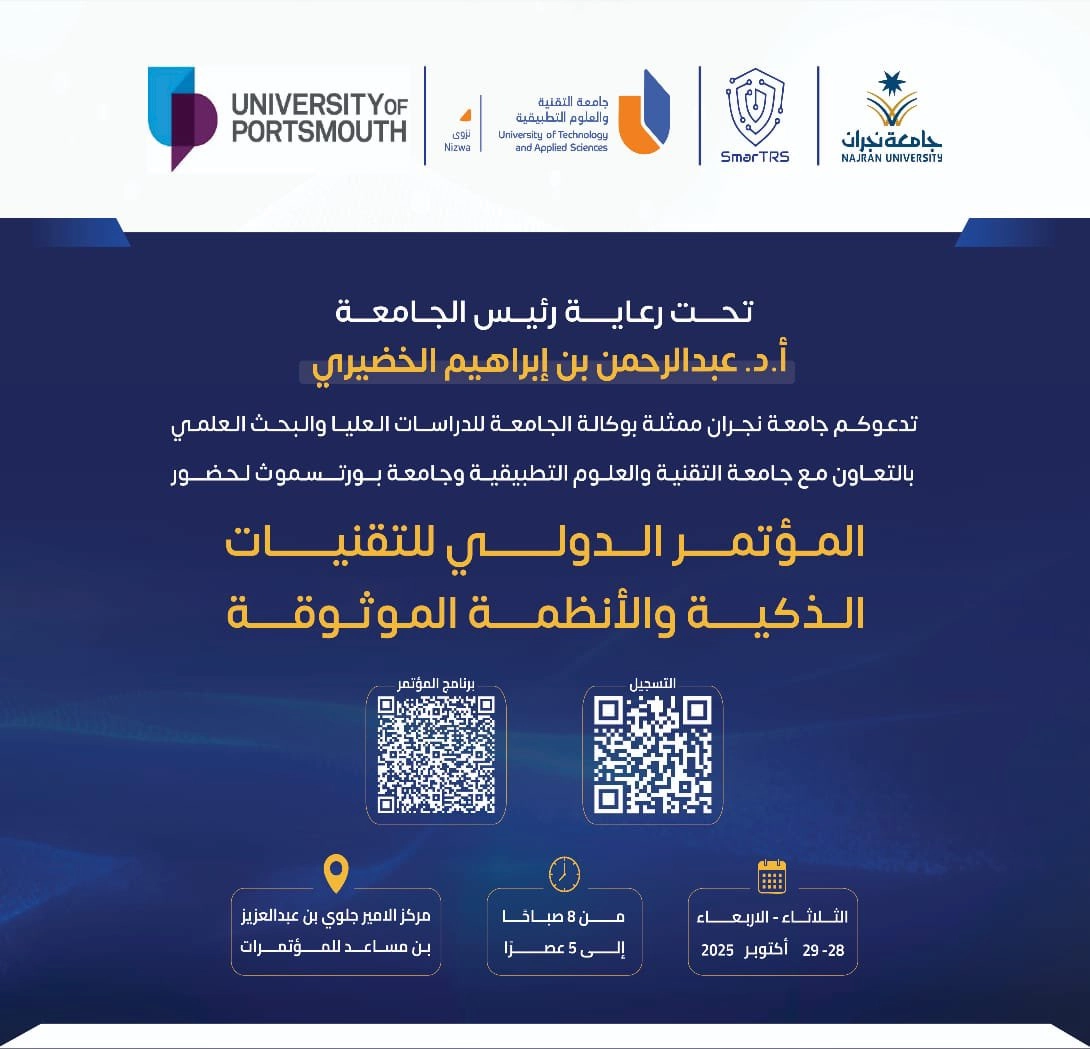 Under the patronage of the University President, Najran University, represented by the Vice Presidency for Graduate Studies and Scientific Research, invites you to attend the International Conference on Smart Technologies and Reliable Systems (SmarTRS2025).